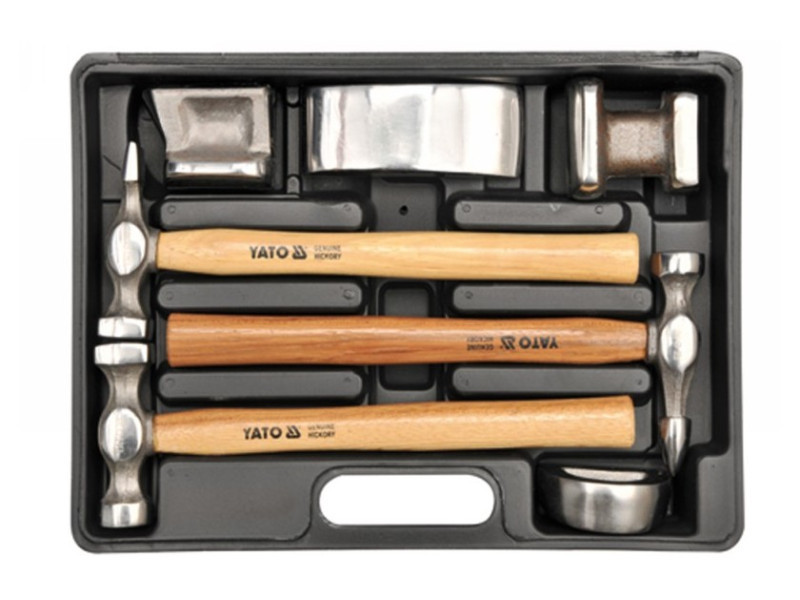 Műanyag tokban lévő készlet lemezek kézi alakításához, autóipari műhelymunkákhoz vagy tetőfedő munkákhoz.