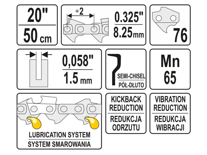 Hossza 20", 76 láncszem, osztás 0,325", szélesség 0,058" (1,5 mm).