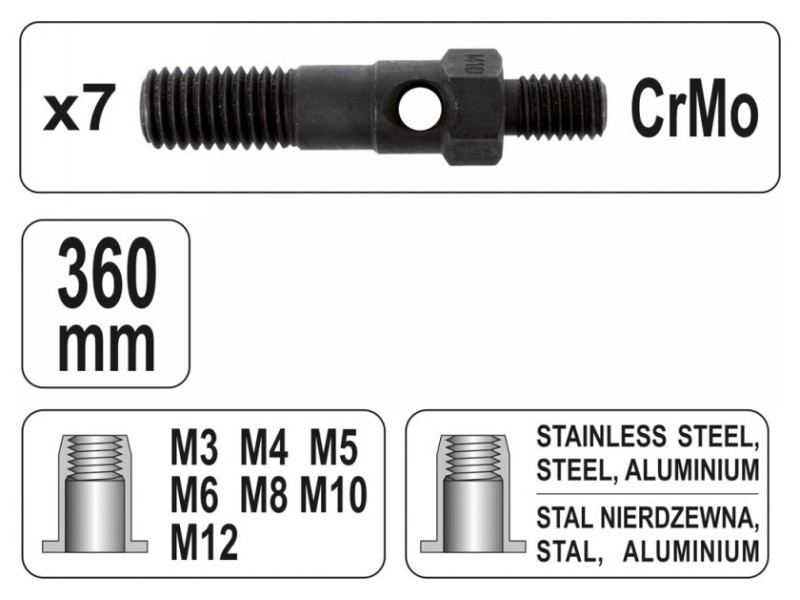Kézi menetesítő YATO márka M3-M12 méretekhez. Végzi anyagok összekapcsolását belső menetes hüvely segítségével. Ez lehetővé teszi további elemek csavarozását fémcsavarokkal vagy csavarokkal.