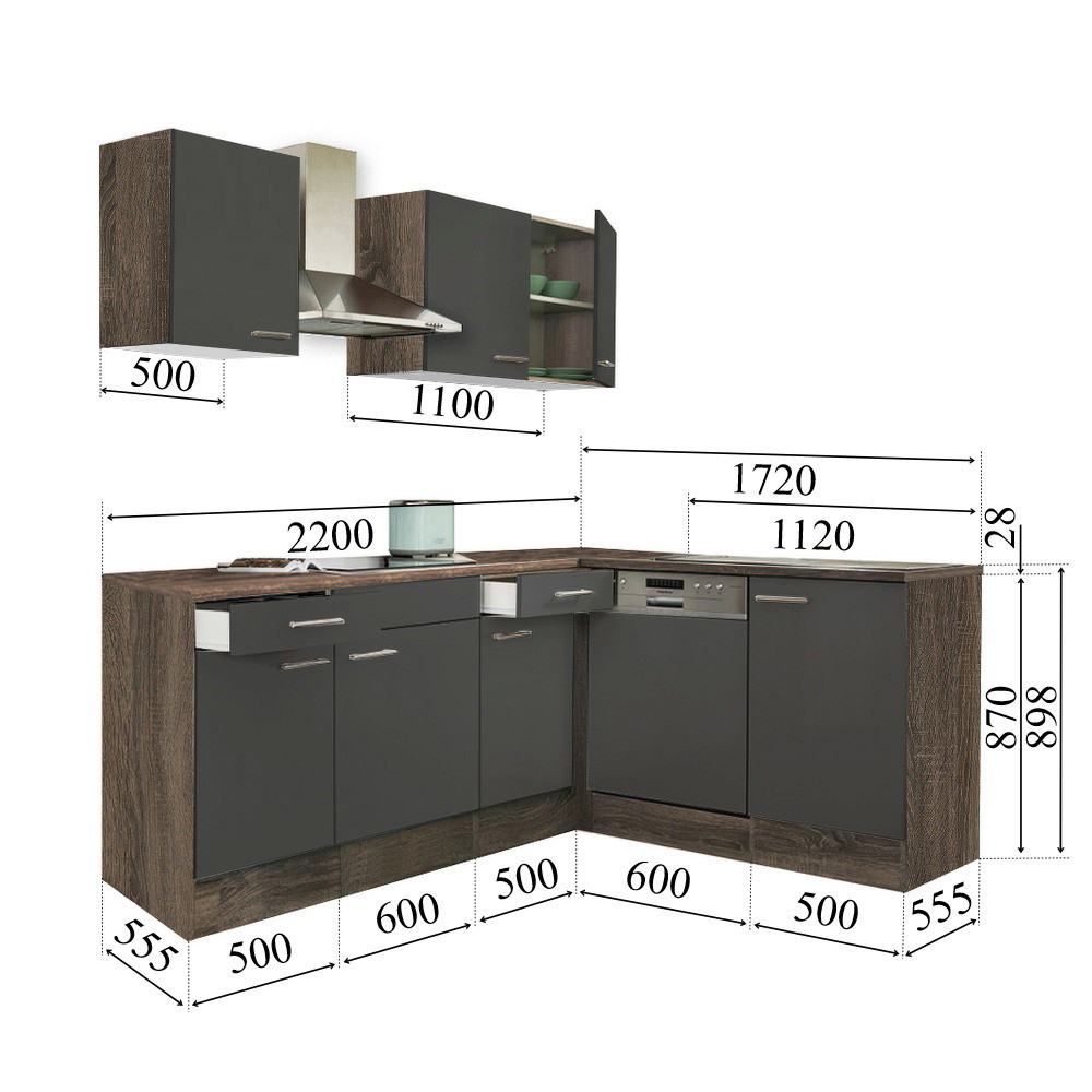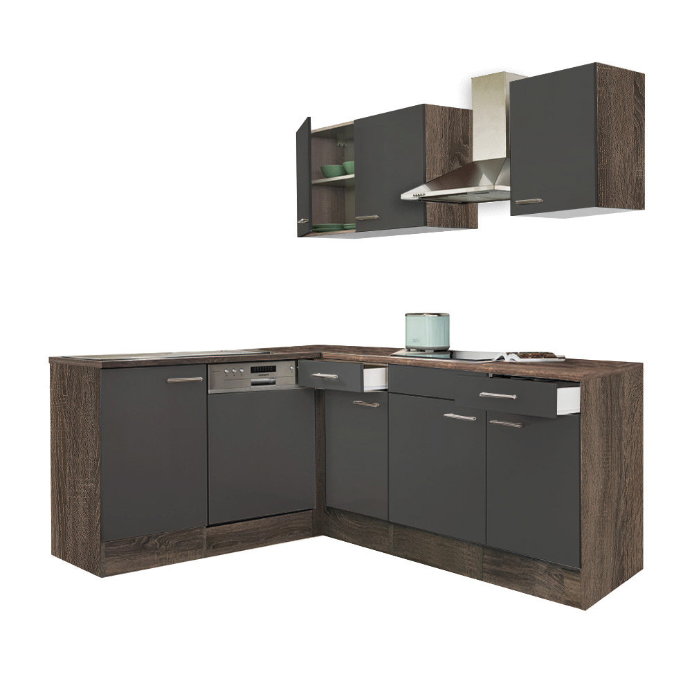 Yorki 220 sarok konyhablokk yorki tölgy korpusz, selyemfényű antracit fronttal. A tökéletes konyha megteremtője!