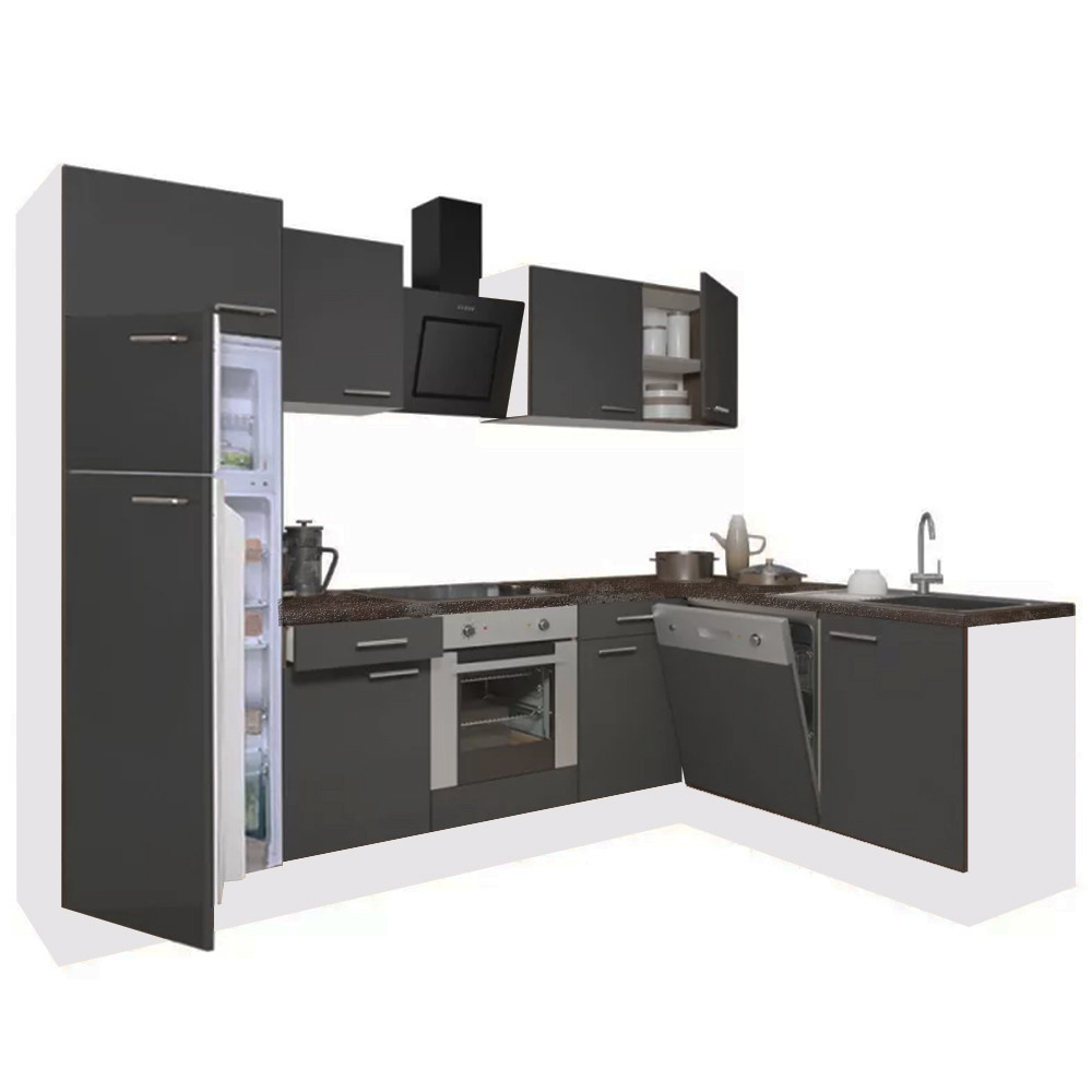 Yorki 280 sarok konyhabútor fehér korpusz,selyemfényű antracit front alsó sütős elemmel felülfagyasztós hűtős szekrénnyel