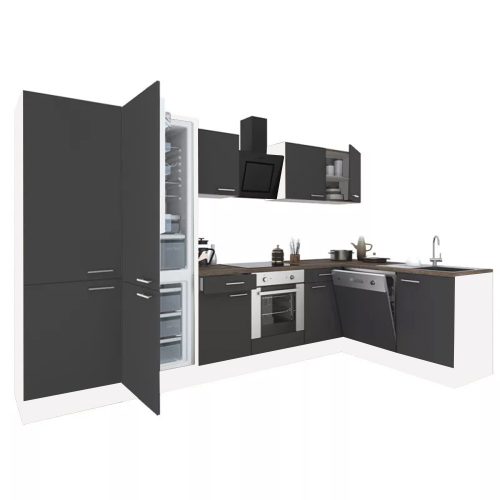Yorki 340 sarok konyhabútor fehér korpusz,selyemfényű antracit front alsó sütős elemmel polcos szekrénnyel, alulfagyasztós hűtős szekrénnyel