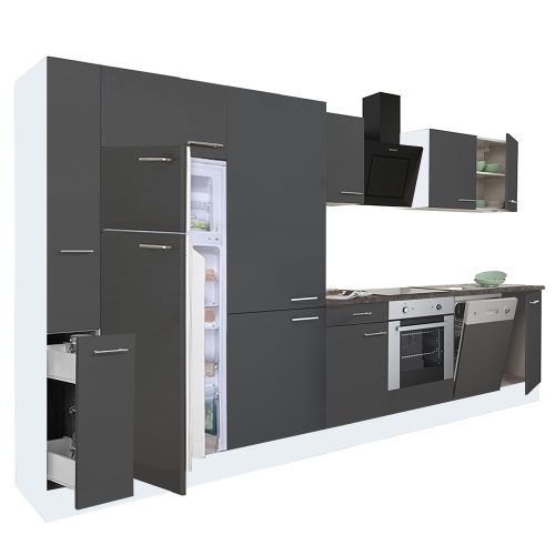Yorki 370 konyhabútor fehér korpusz,selyemfényű antracit front alsó sütős elemmel polcos szekrénnyel és felülfagyasztós hűtős szekrénnyel
