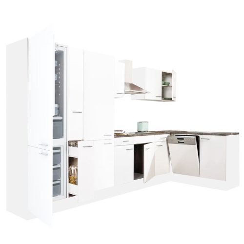Yorki 370 sarok konyhabútor fehér korpusz,selyemfényű fehér fronttal polcos szekrénnyel és alulfagyasztós hűtős szekrénnyel