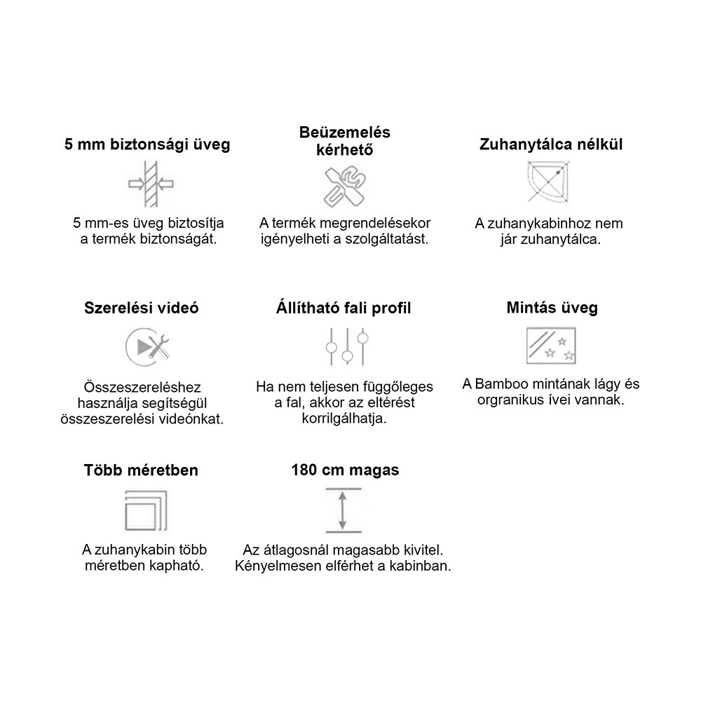 A Leziter Spirit Bamboo zuhanykabin üvege 5 mm vastag, edzett biztonsági üvegből készül, amely a hagyományos üvegnél jóval ellenállóbb és biztonságosabb. A savmart minta elegánsan tompítja az átláthatóságot, így a zuhanytér diszkréten takart marad, miközben átengedi a fényt és megőrzi a fürdőszoba tágas hatását. A matt, sima felület ellenáll a vízkőnek és az ujjlenyomatoknak. Az edzett üveg törés esetén apró, tompa szilánkokra esik szét, így biztonságos választás a mindennapi használatban, akár családok számára is.
