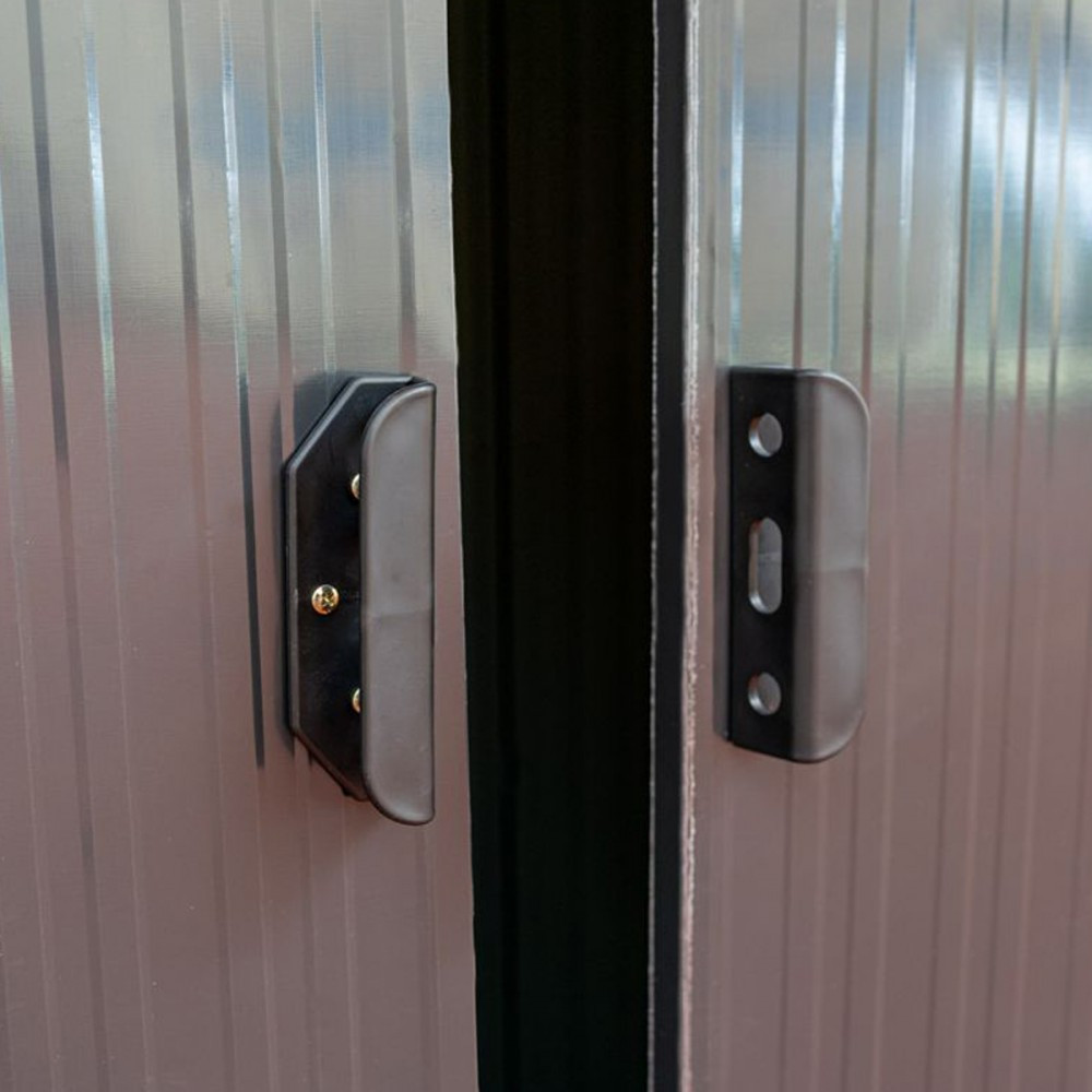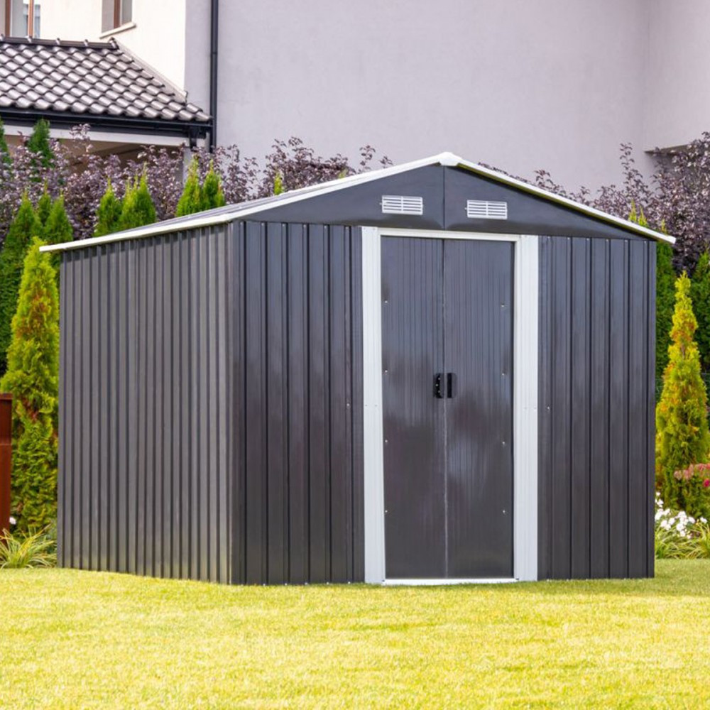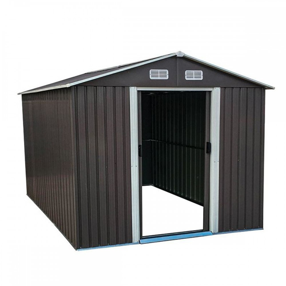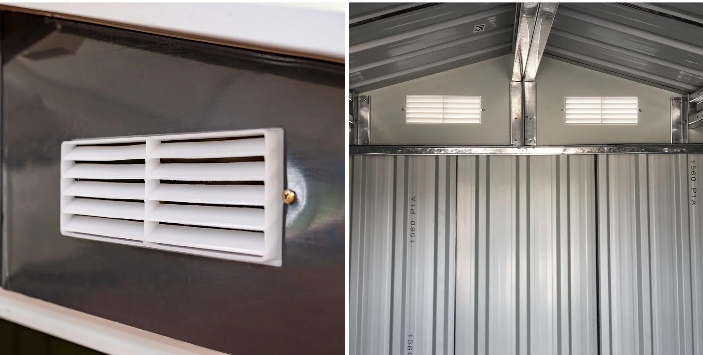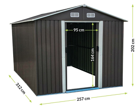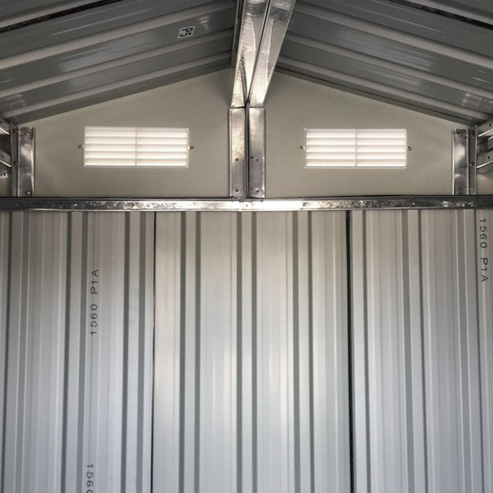 A fém szerszámház tolóajtóval rendelkezik,ennek köszönhetően nem sok helyet foglal.A kerti ház előnye az elülső fal felső részén elhelyezett szellőzőnyílások, melyek megakadályozzák a ház párásodását ezzel elkerülve a nem kívánatos penészesedést.