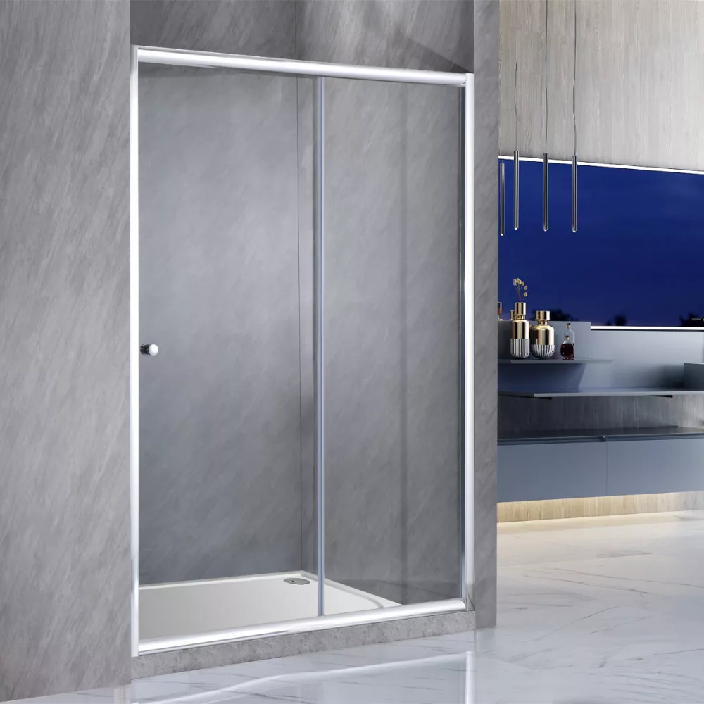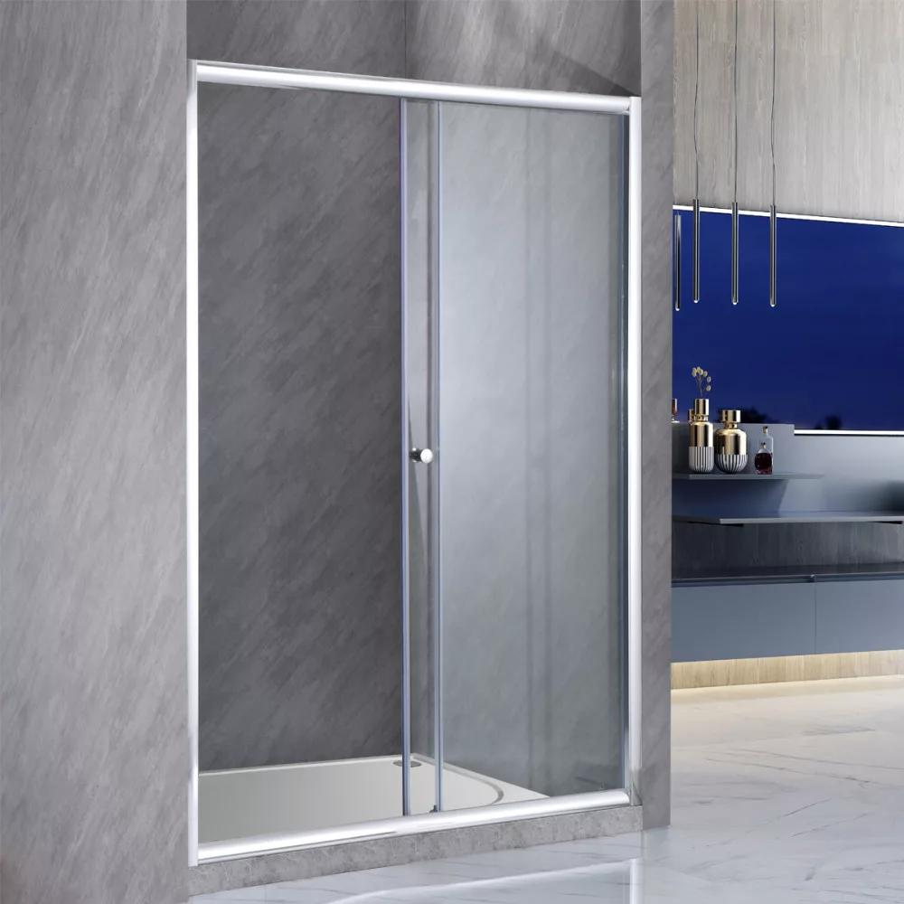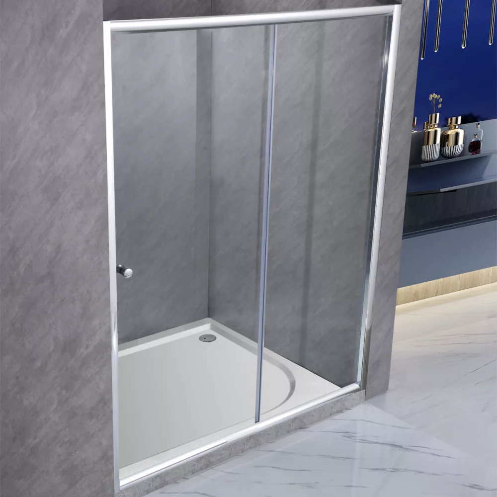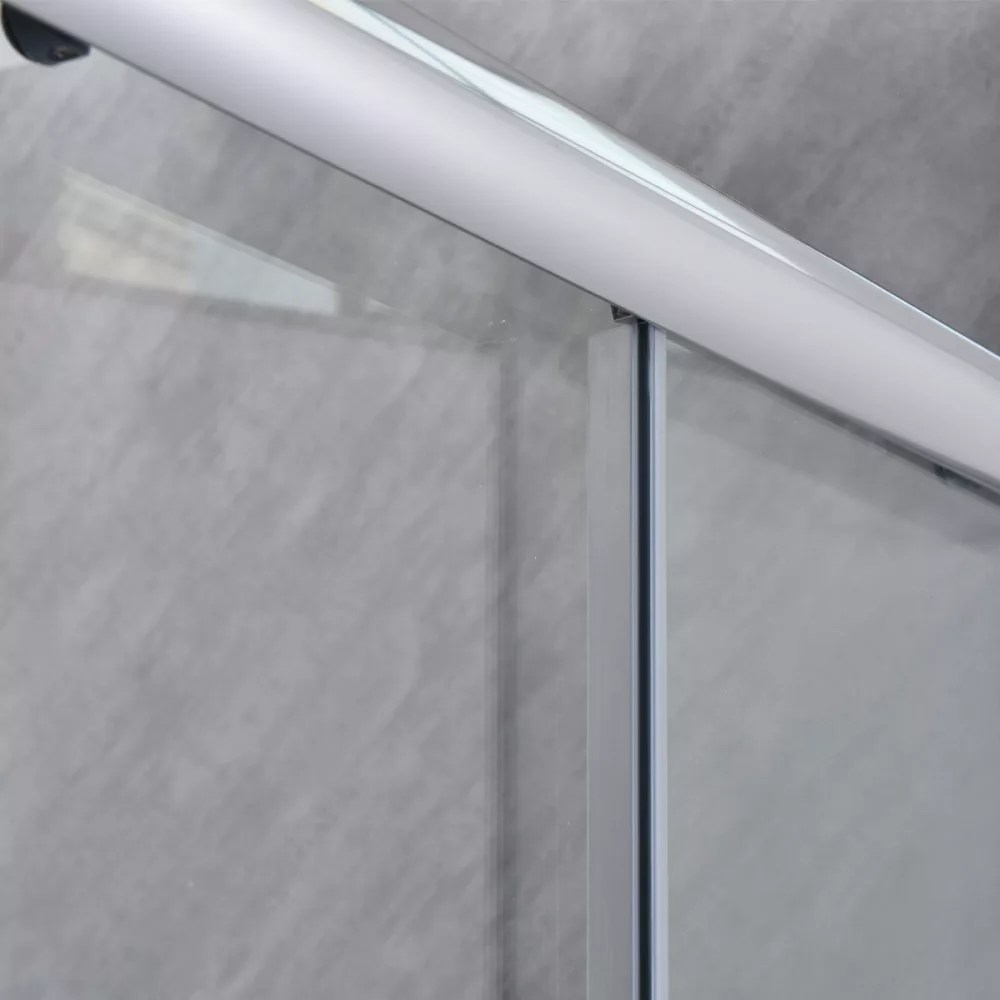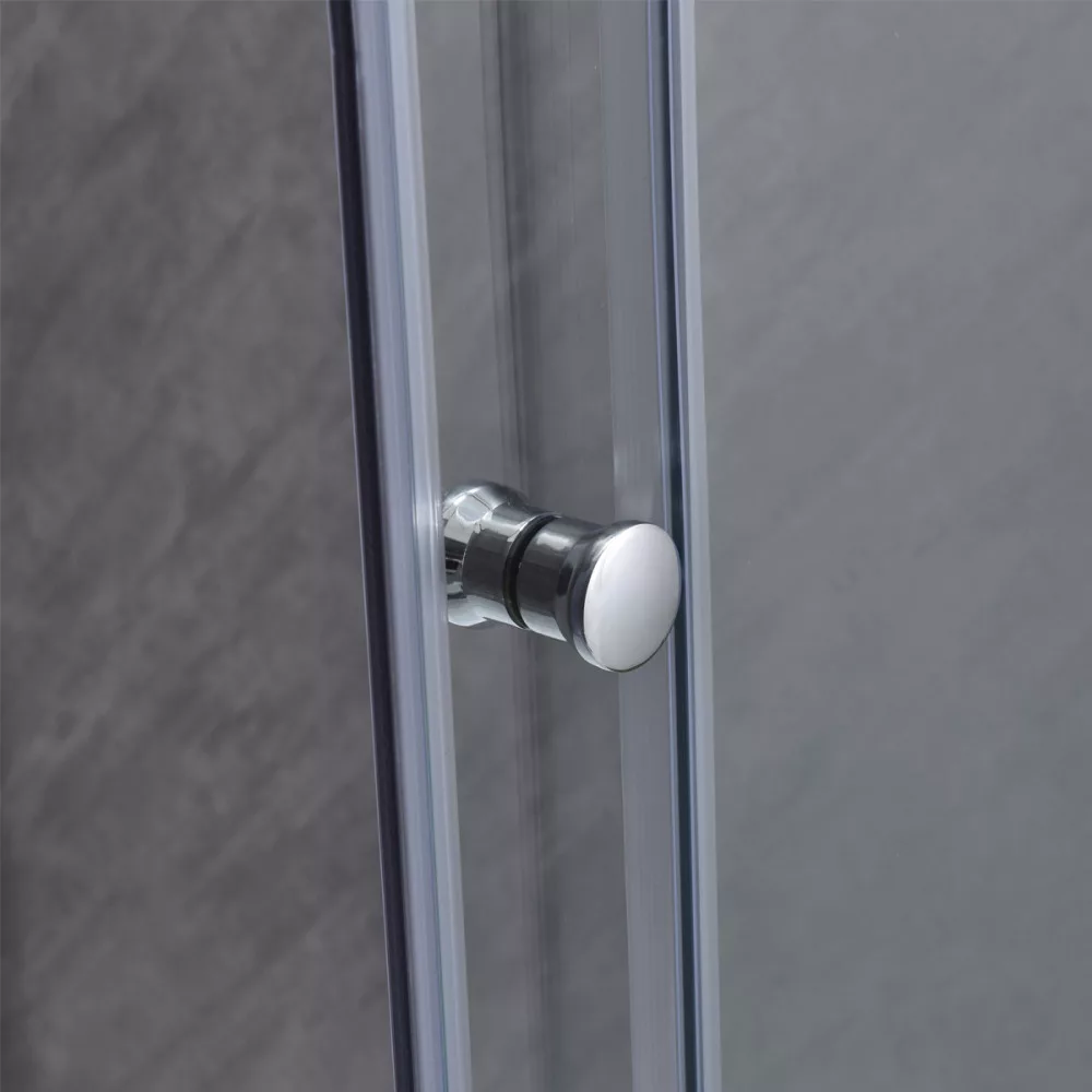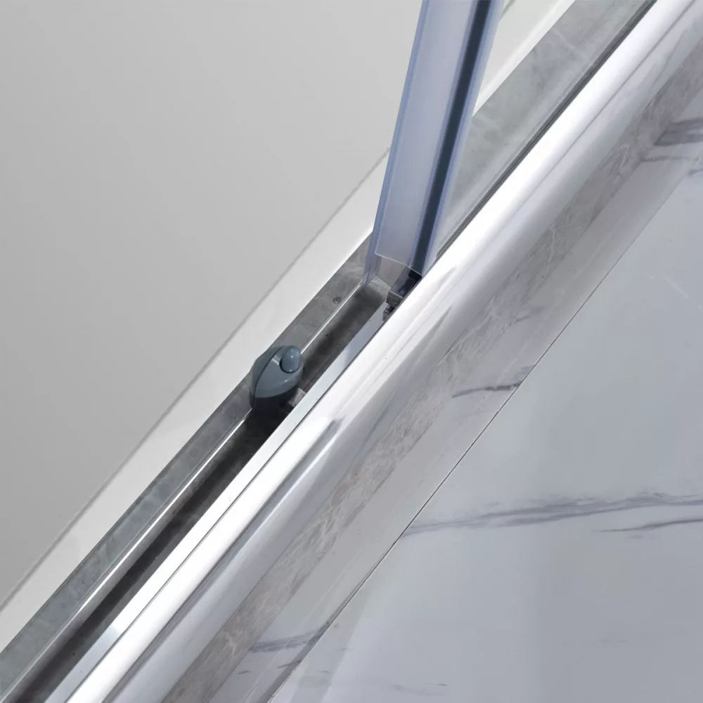 6 mm edzett üveg, krómozott alumínium profilok, felső és alsó dupla görgős ajtónyitó rendszer easy clean funkcióval, cink ötvözet ajtónyitó gomb, profil állítási lehetőség 15 mm mindkét oldalon
