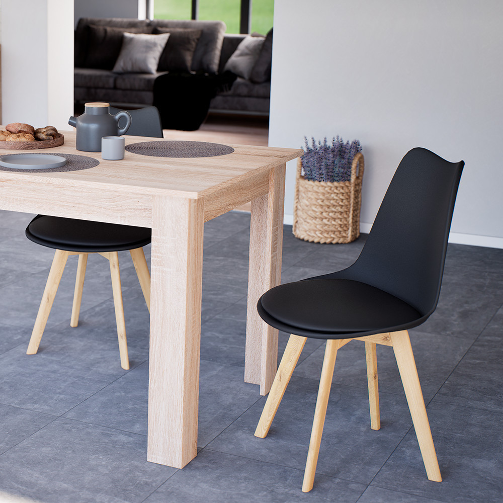 Az ülőfelület strapabíró polipropilénből készült, amely egyszerre tartós és könnyen tisztítható – ideális választás mindennapos használatra. A szintetikus bőrhatású PVC párnázat extra kényelmet nyújt, miközben egyszerűen letörölhető, így családok számára is praktikus megoldás. A bükk színű, erős fa lábak biztosítják a stabilitást és a hosszú élettartamot.