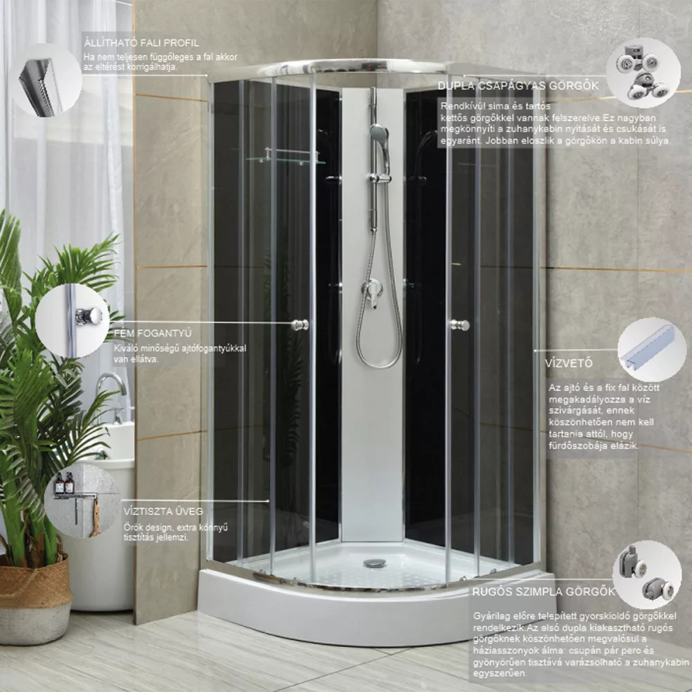 • Típus: íves zuhanykabin zuhanytálcával