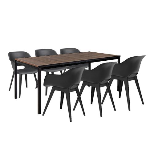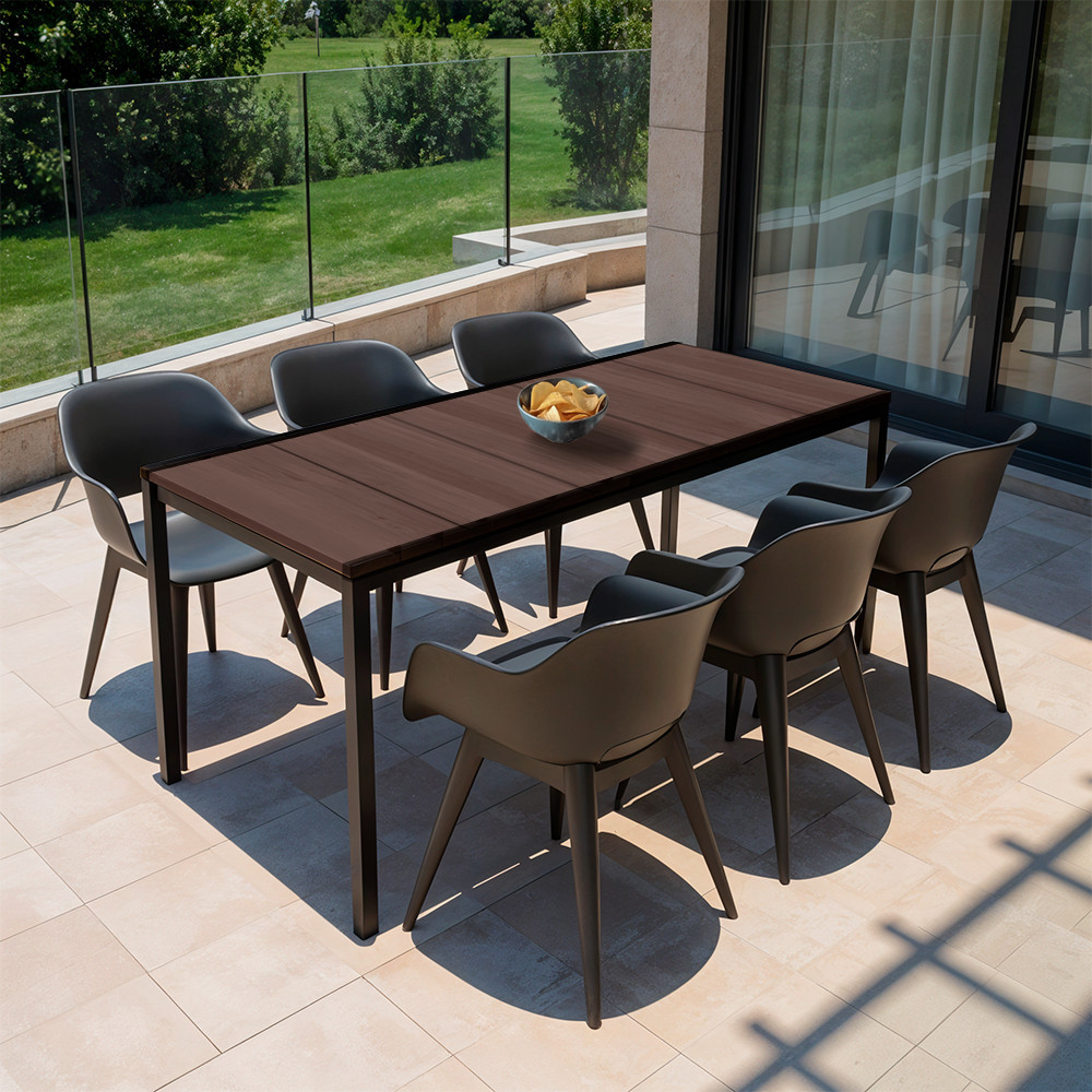 A meleg, természetes dió tónusú asztallap és a hűvös grafit székek kontrasztja minden stílusú kültéri térben magára vonzza a tekintetet: skandináv, mediterrán vagy ipari környezetben is kifinomult megjelenést ad.