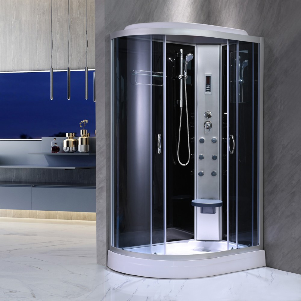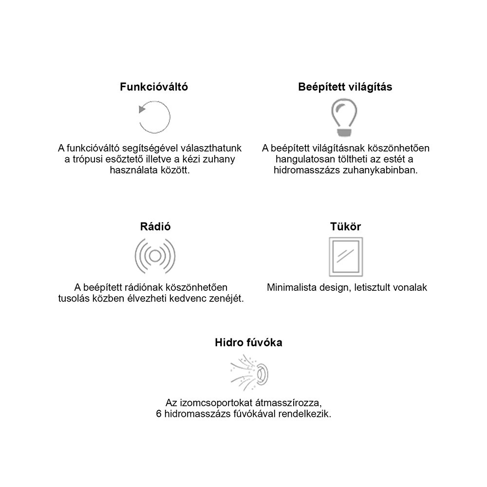 Az Aria hidromasszázs zuhanykabin kialakításának köszönhetően tágas teret biztosít használata közben. 4 mm-es edzett biztonsági üveggel van ellátva ezzel ügyelve a biztonságra. Az Aria mélytálcával kapható ezzel még sokoldalúbbá téve a terméket. A hidromasszázs zuhanykabin 6 fúvókás masszázsrendszerrel is felvan szereleve. Ezenfelül a termékben minden olyan kiegészítő megtalálható ami a tökéletes kényelem megteremtését szolgálja. Ilyen a tükör, polc, ülőke, felső világítás, funkcionális panel és a kezelőpanel.A funkcionalitás mellett természetesen a hidromasszázs zuhanykabin megjelenésére is nagy figyelmet fordítottak. Üvegfelületének, fekete hátfalának és letisztult, modern vonalainak köszönhetően elegáns megjelenést teremt minden fürdőszábanak.