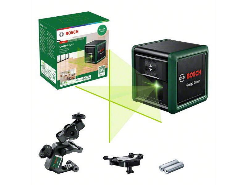 Zöldülj be teljesen a Bosch új generációs Quigo Green kereszt vonallézerével, amely kiváló láthatóságot és könnyű kezelhetőséget biztosít a barkácsprojektekben. Élénk, zöld kereszt lézervonalaival a Quigo Green tökéletes beállítási megoldás az igen világos fényviszonyok közötti munkavégzéshez. +/- 0,6 mm/m-es megnövelt pontossággal és maximum 12 m-es hatósugárral rendelkezik. A még nagyobb kényelem érdekében ez a sokoldalú keresztvonalas lézer egy MM 2 univerzális szorítót és egy adapterlemezt tartalmaz az egyszerű rögzítéshez. A Quigo Green +/-4°-os tartományon belül szintezi saját magát a tükrök, polcok vagy csempék egyenes beállításának szavatolásához.