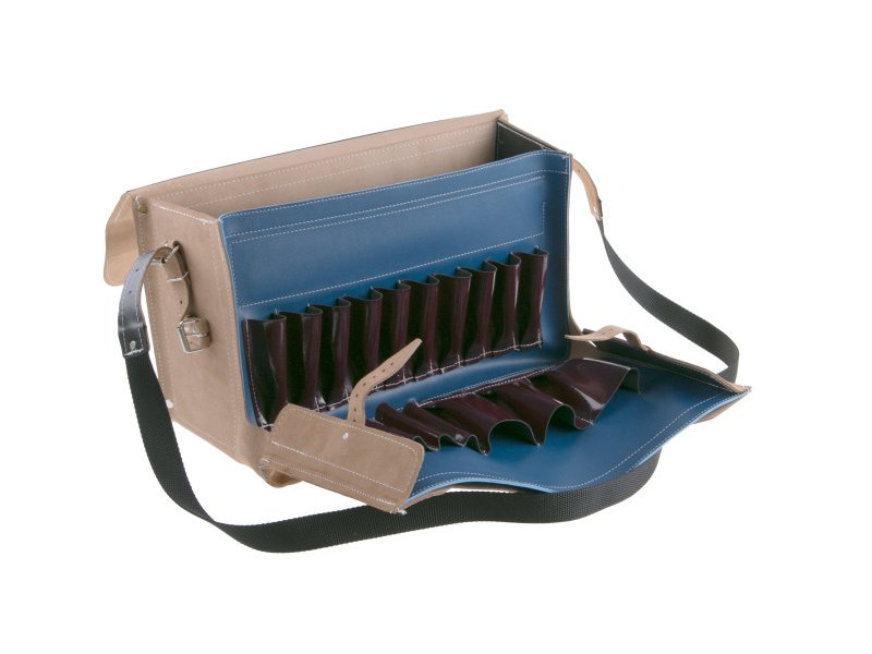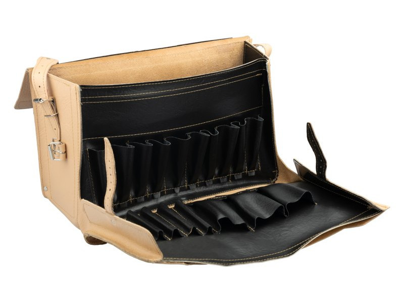 Természetes bőrből készült villanyszerelő összecsukható táska. Nyíló elején zsebekkel a szerszámok rendezett tárolására és egy n