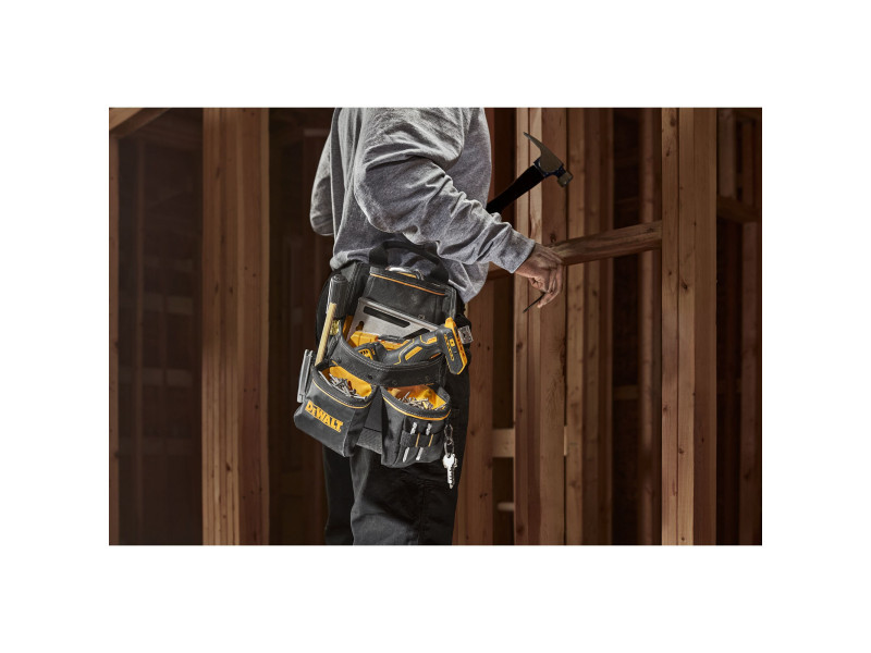 A DeWALT professzionális szerszámtartó övtáskájának (DWST40603-1) a kimondottan csavarok, szegek szeparált tárolására lett tervezve. Kiegészítő zsebek mérőszalagnak, festékzsinórnak, bit készletnek, fogóknak és egyéb szerszámoknak is helyet kaptak. Felső élén a táskának egy masszív fület alakítottak ki, ha adott esetben nem övön szeretnék hordani, hanem kézben. A zsebek és tartók száma ezen az egy táskán 13 db!