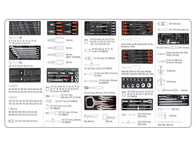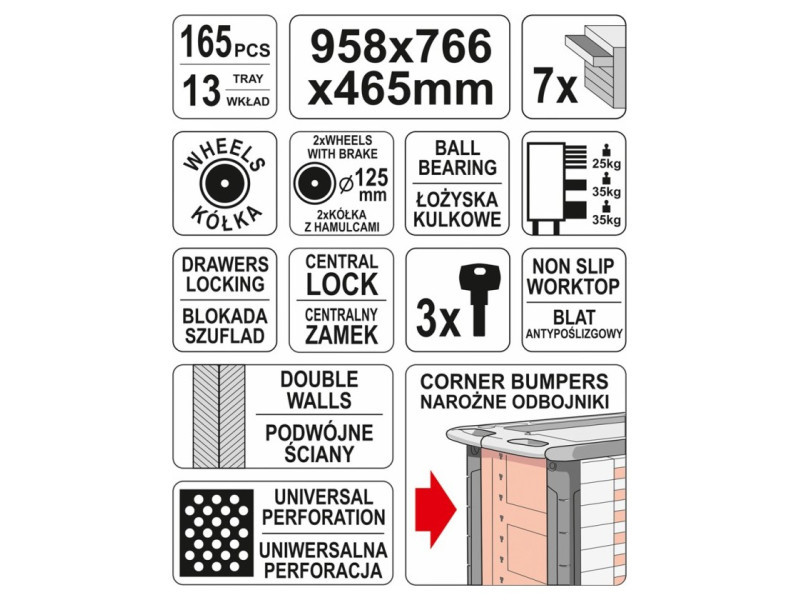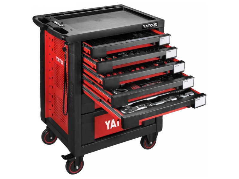 YATO márkájú szerszámos szekrény. 7 fiókkal van felszerelve, golyóscsapágyas csúszkákkal. A felső 5 fiók 165 gondosan kiválasztott szerszámot tartalmaz. A profilok dupla acéllemezből készültek - az univerzális perforáció lehetővé teszi a szekrény utólagos felszerelését. Központi zár és az egyes fiókok egyedi zárása.