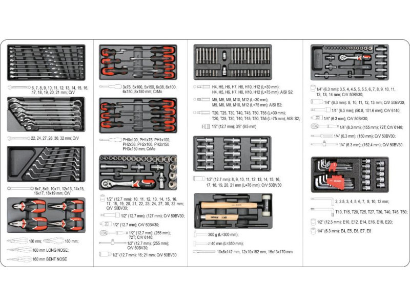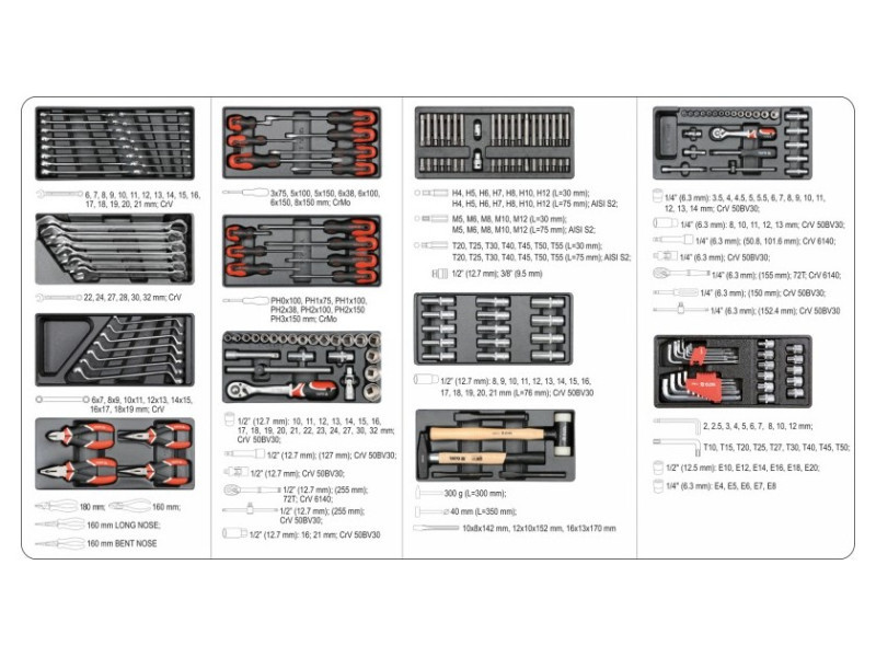 • HEX, TORX kulcsok, dugókulcsok, 25 darab (1/2" (12,5 mm): E10, E12, E14, E16, E18, E20; 1/4" (6,3 mm): HEX: 2, 2,5, 3, 4, 5, 6, 7, 8, 10, 12 mm; TORX: T10, T15, T20, T25, T27, T30, T40).