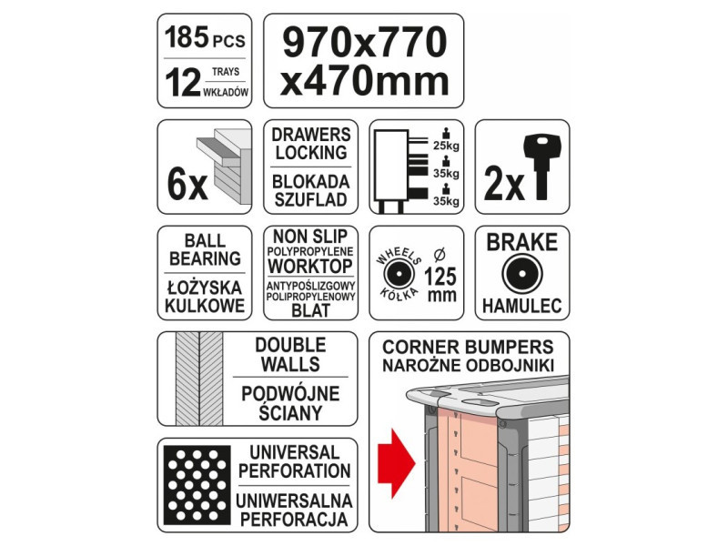 YATO szerszámszerviz szekrény. 6 zárszerkezettel ellátott fiókkal rendelkezik, amelyek golyóscsapágyas csúszdákra vannak szerelve - a 3 felső polc teherbírása 25 kg, a 3 alsó polcé 35 kg. A szekrény praktikus fogantyúval és tartós gumikerekekkel van felszerelve, így a mozgatása nem jelent gondot.