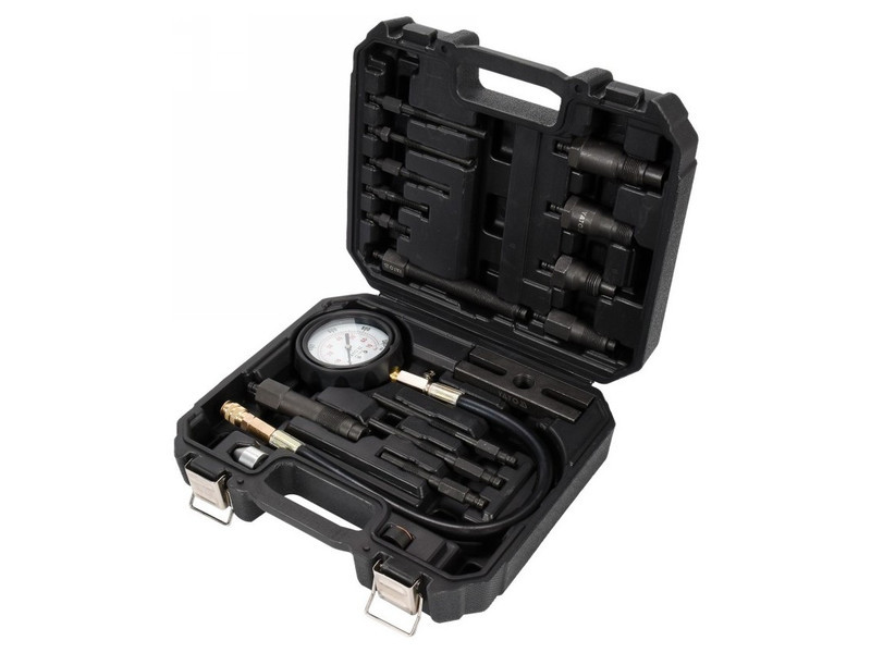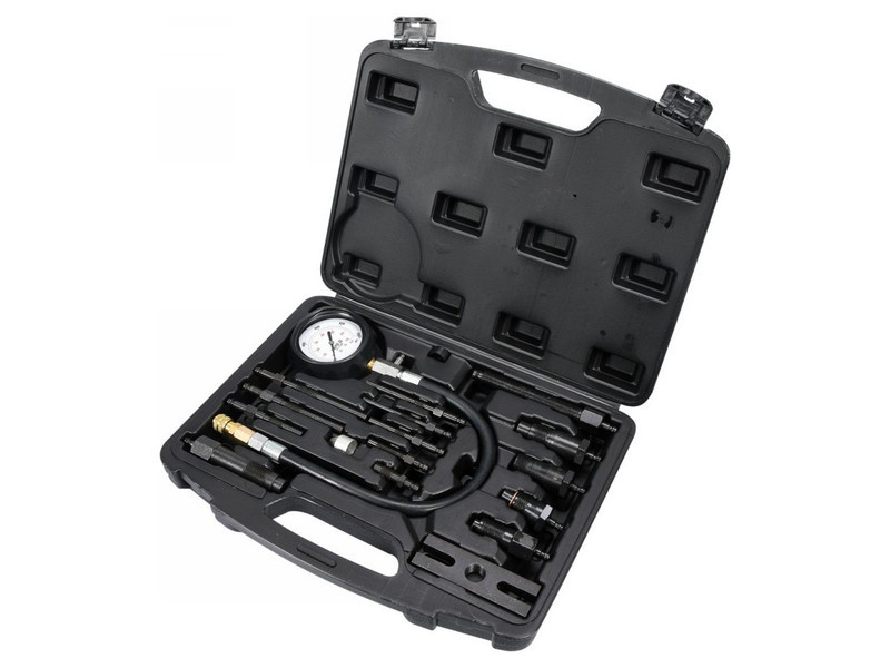 Az autóipari szervizekben professzionális használatra tervezett mérőműszer. A VW, Audi, Seat, Skoda, Fiat, Alfa Romeo, Lancia, Peugeot, Ford, Opel, Toyota, Mercedes, Rover kompressziós gyújtású motorok diagnosztikájához. C45-ös acélból készült, a megfelelő szerszám élettartam biztosítása érdekében felületi oxidációval. - Izzítógyertya adapter 91 mm, M10 x 1 - Izzítógyertya adapter 119 mm, M10 x 1 - Izzítógyertya adapter 135 mm, M10 x 1,25 - Izzítógyertya adapter 118 mm, M22 x 1,5 - Izzítógyertya adapter 113 mm, M10 x 1 - Izzítógyertya adapter 102 mm, M10 x 1 - Izzítógyertya adapter 83 mm, M10 x 1 - Izzítógyertya adapter 64 mm, M10 x 1,25 - izzítógyertya adapter 47 mm, M12 x 1,25 - injektor adapter 88 mm, M24 x 1,5 - injektor adapter 73 mm, M22 x 1,5 - injektor adapter 63 mm, M24 x 2 - injektor adapter 75 mm, M20 x1,5 - univerzális adapter 160 mm - H-szerelvény - nyomásmérő 500 mm - kioldószelep - használati utasítás - hordtáska