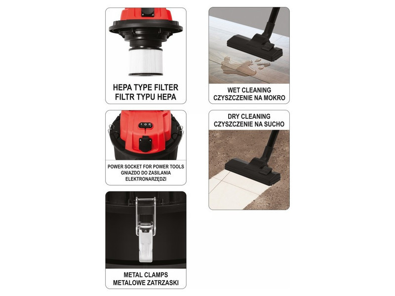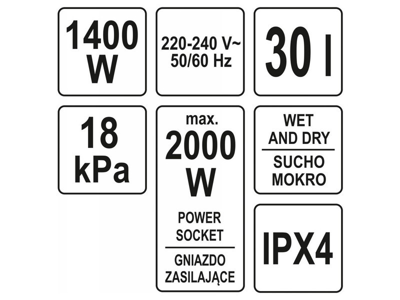 YATOműhelyporszívó 1400 W-os és 18 kPa szívóteljesítménnyel. 30 L-es tartállyal rendelkezik. A porszívó teleszkópos, antisztatikus csővel van felszerelve. Beépített aljzattal is rendelkezik, amely lehetővé teszi az elektromos szerszámok táplálását.