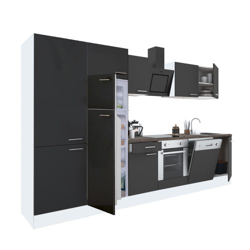 Yorki 330 konyhabútor fehér korpusz,selyemfényű antracit front alsó sütős elemmel polcos szekrénnyel és felülfagyasztós hűtős szekrénnyel