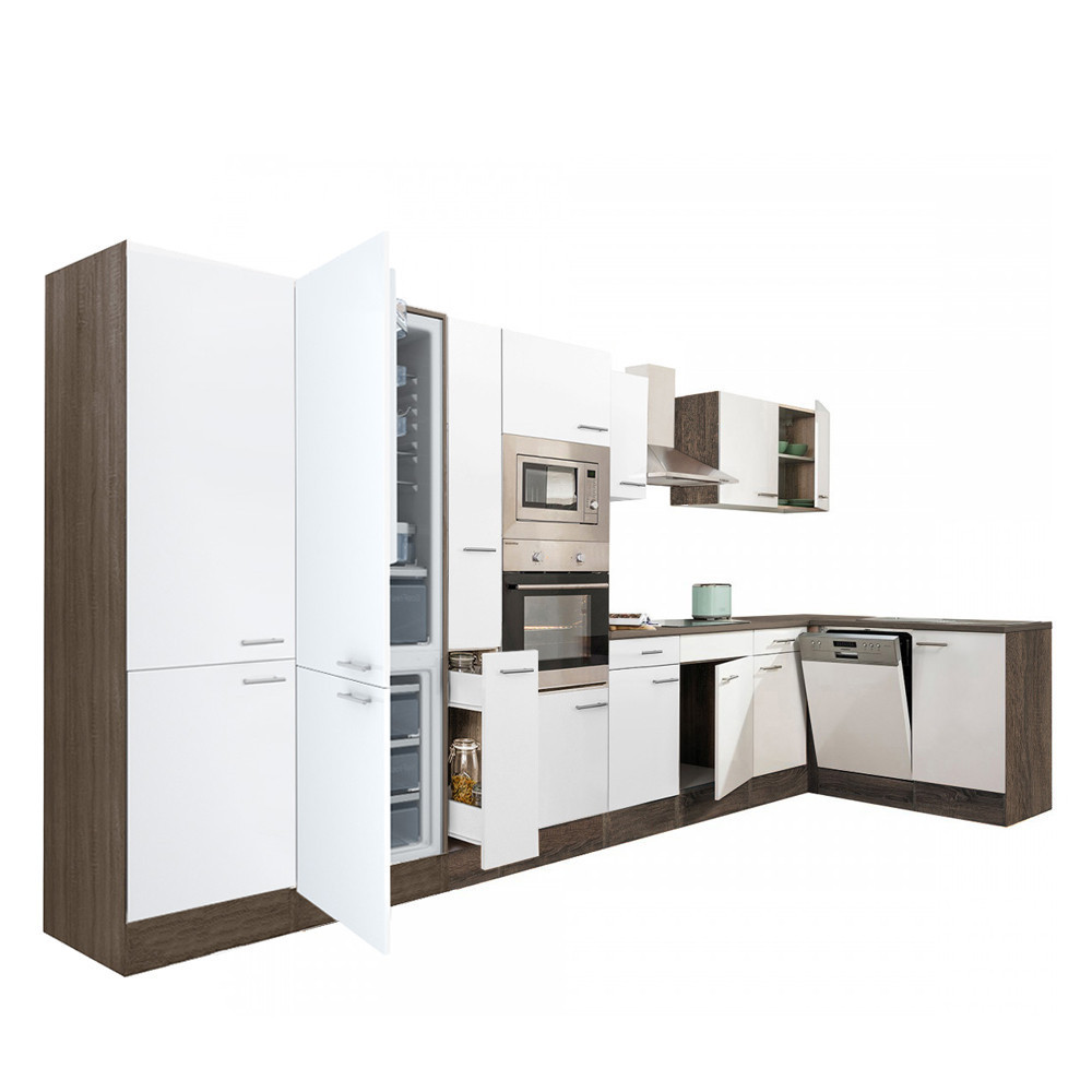 Yorki 430 sarok konyhabútor yorki tölgy korpusz,selyemfényű fehér fronttal alulagyasztós hűtős szekrénnyel