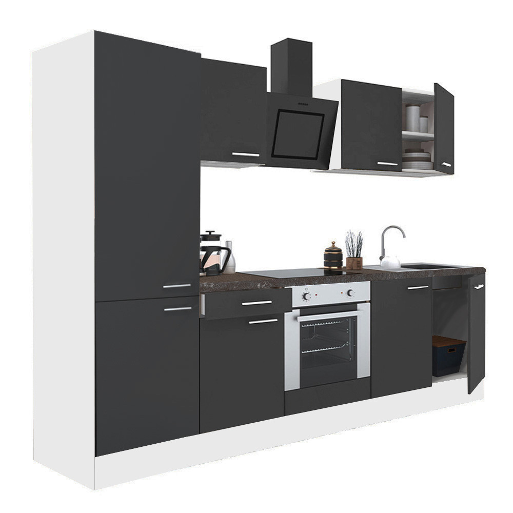 Yorki 270 konyhabútor fehér korpusz,selyemfényű antracit front alsó sütős elemmel polcos szekrénnyel