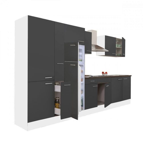 Yorki 360 konyhabútor fehér korpusz,selyemfényű antracit fronttal polcos szekrénnyel és felülfagyasztós hűtős szekrénnyel