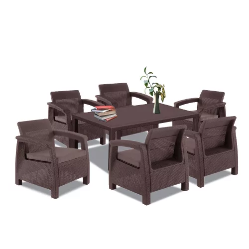 A stílusos Big duo szabadidő bútor szett maximális kényelmet garantál a felhasználók számára. A szettet modern dizájn jellemez, melyet természetes rattan fonás inspirált. A szett stabilitását és kényelmét szolid felépítésének és átgondolt szerkezetének köszönheti. A bútor szett hat egyszemélyes fotelt és egy asztalt tartalmaz. A Big termékvonal - kényelmes párnákkal kapható. A bútorok ellenállnak az időjárás viszontagságainak és az UV sugárzásnak.A bútorokat a Curvergyártja, kiknek termékei megtalálhatóak még Keter márkanév alatt is. A Big egy kiváló minőségű európai termék, amely a legjobb minőségű fröccsöntött műanyagból készült.