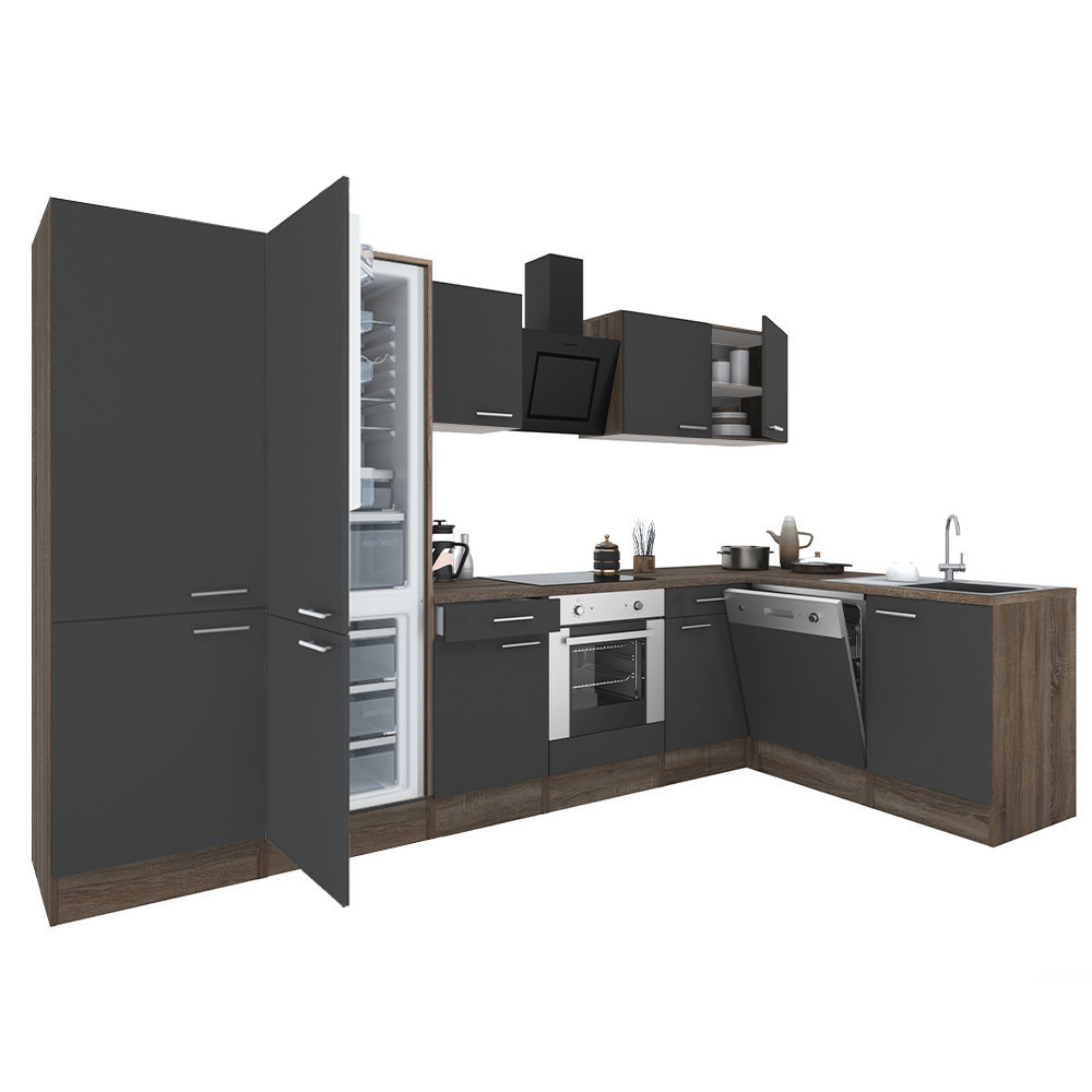 Yorki 340 sarok konyhabútor yorki tölgy korpusz,selyemfényű antracit front alsó sütős elemmel polcos szekrénnyel, alulfagyasztós hűtős szekrénnyel