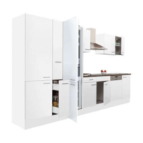 Yorki 370 konyhabútor fehér korpusz,selyemfényű fehér fronttal polcos szekrénnyel és alulfagyasztós hűtős szekrénnyel