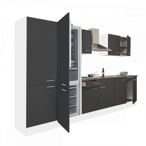 Yorki 330 konyhabútor fehér korpusz,selyemfényű antracit fronttal polcos szekrénnyel és alulfagyasztós hűtős szekrénnyel