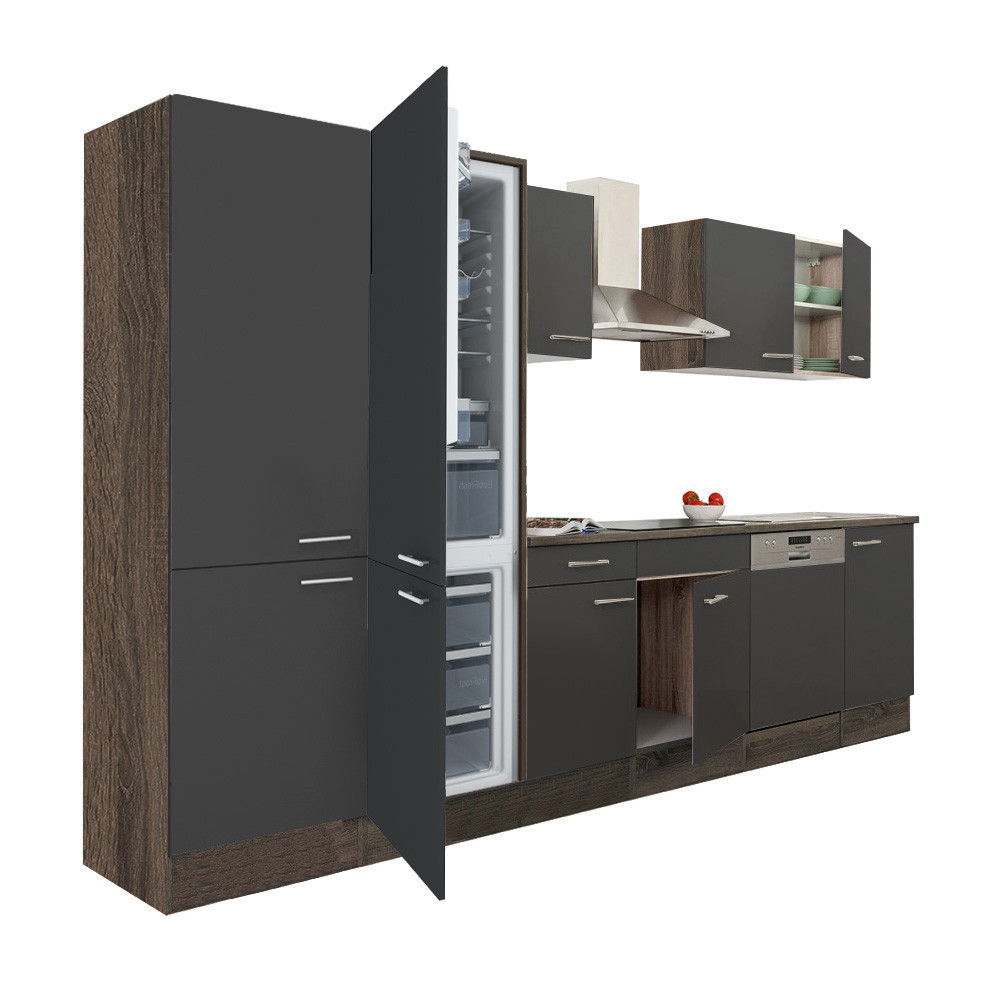 Yorki 340 konyhabútor yorki tölgy korpusz,selyemfényű antracit fronttal polcos szekrénnyel és alulfagyasztós hűtős szekrénnyel