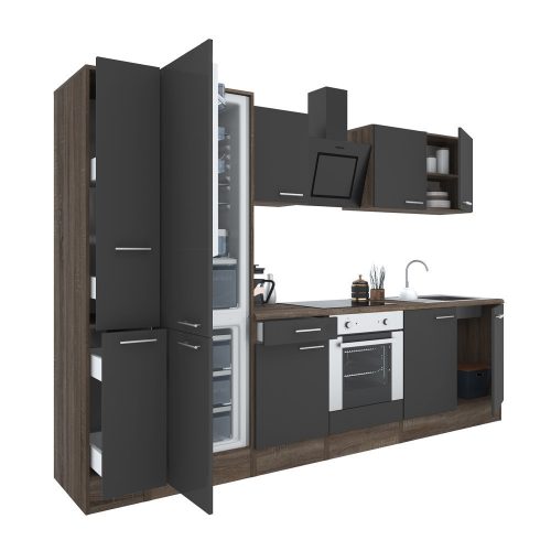 Yorki 300 konyhabútor yorki tölgy korpusz,selyemfényű antracit front alsó sütős elemmel alulfagyasztós hűtős szekrénnyel