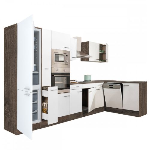 Yorki 370 sarok konyhabútor yorki tölgy korpusz,selyemfényű fehér fronttal alulagyasztós hűtős szekrénnyel