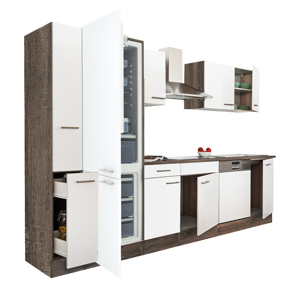 Yorki 310 konyhabútor yorki tölgy korpusz,selyemfényű fehér fronttal alulfagyasztós hűtős szekrénnyel
