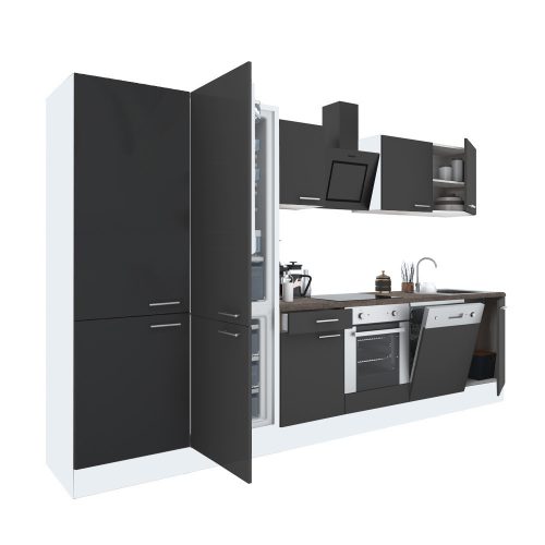 Yorki 330 konyhabútor fehér korpusz,selyemfényű antracit front alsó sütős elemmel polcos szekrénnyel és alulfagyasztós hűtős szekrénnyel