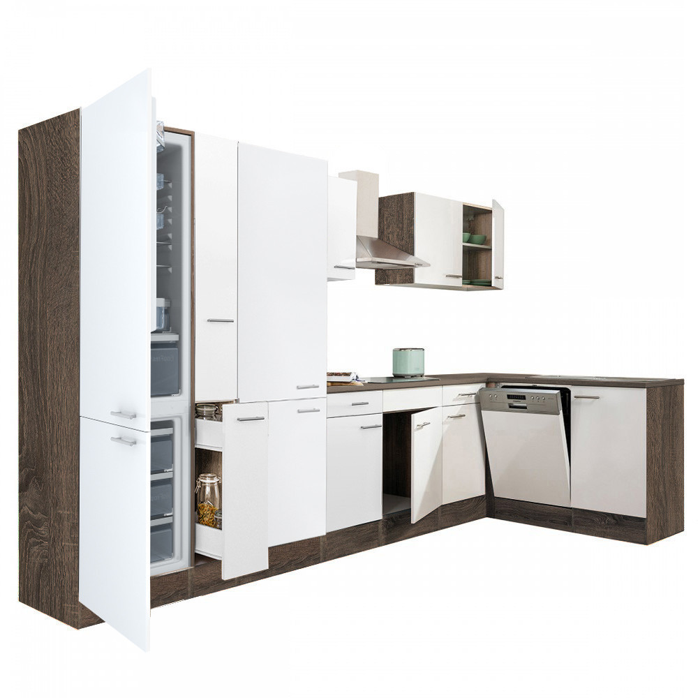 Yorki 370 sarok konyhabútor yorki tölgy korpusz,selyemfényű fehér fronttal polcos szekrénnyel és alulfagyasztós hűtős szekrénnyel