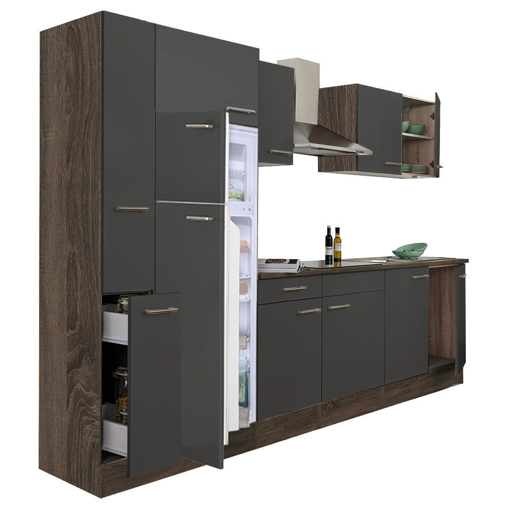 Yorki 300 konyhabútor yorki tölgy korpusz,selyemfényű antracit fronttal felülfagyasztós hűtős szekrénnyel