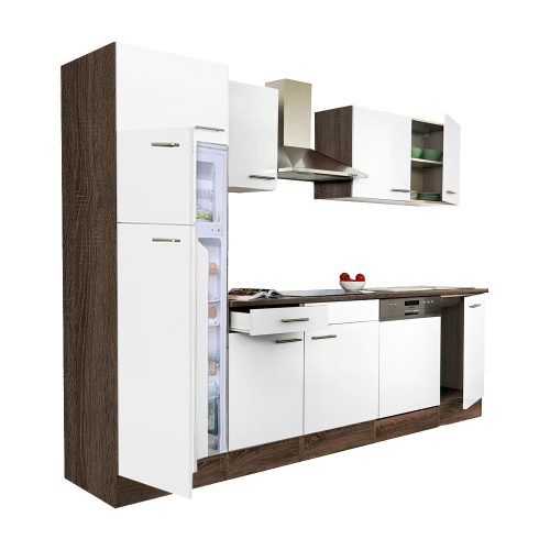 Yorki 280 konyhabútor yorki tölgy korpusz,selyemfényű fehér fronttal felülfagyasztós hűtős szekrénnyel