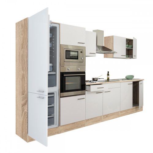 Yorki 330 konyhabútor sonoma tölgy korpusz,selyemfényű fehér fronttal alulfagyasztós hűtős szekrénnyel