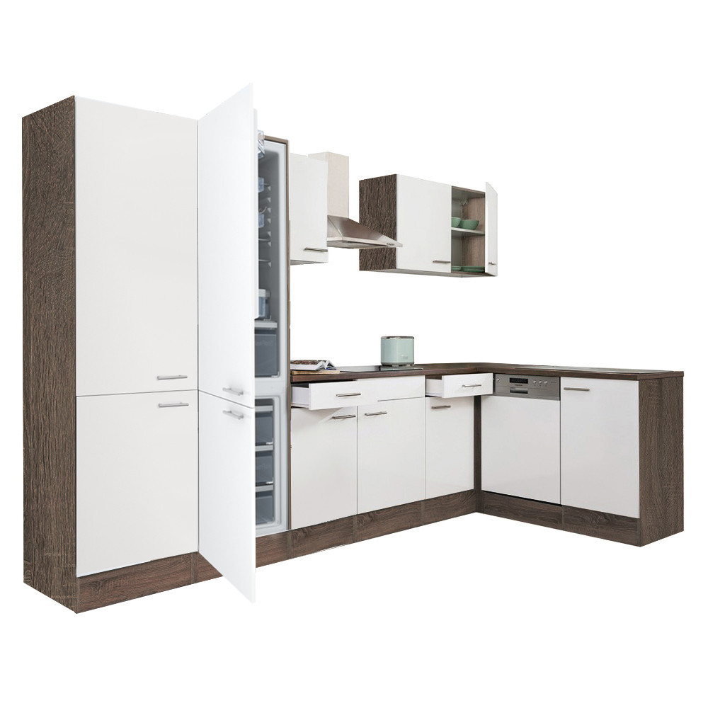 Yorki 340 sarok konyhabútor yorki tölgy korpusz,selyemfényű fehér fronttal polcos szekrénnyel és alulfagyasztós hűtős szekrénnyel