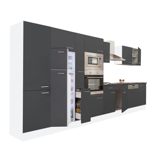 Yorki 430 konyhabútor fehér korpusz,selyemfényű antracit fronttal felülfagyasztós hűtős szekrénnyel