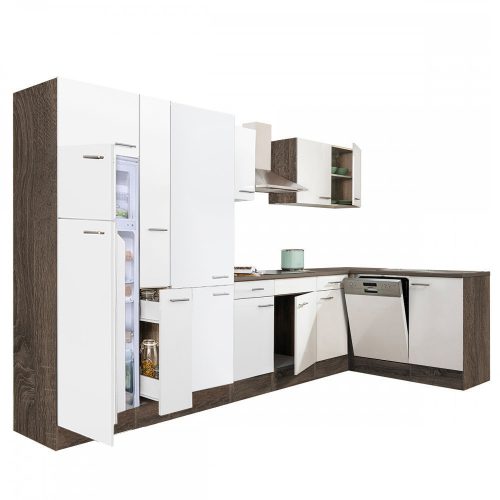 Yorki 370 sarok konyhabútor yorki tölgy korpusz,selyemfényű fehér fronttal polcos szekrénnyel és felülfagyasztós hűtős szekrénnyel