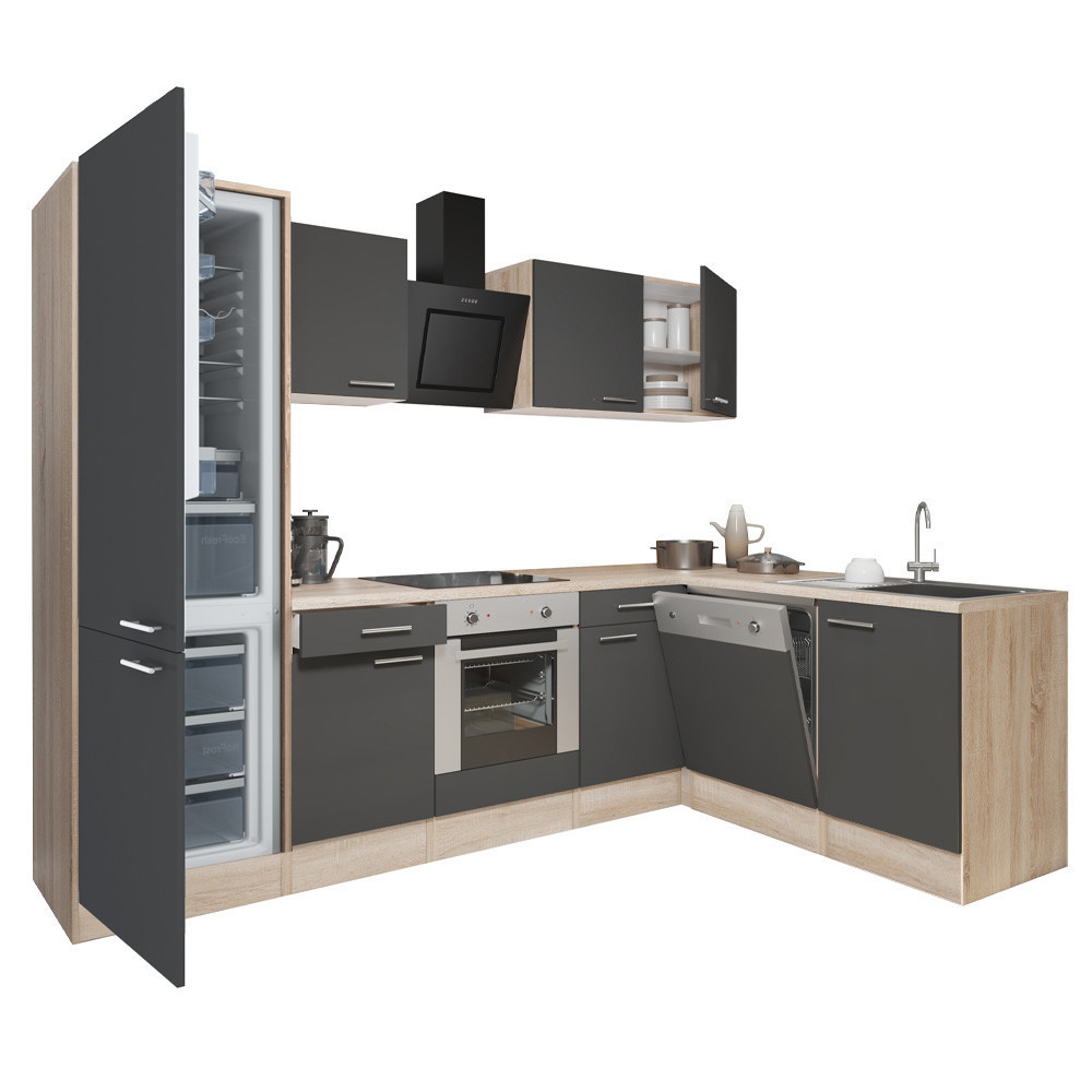 Yorki 280 sarok konyhabútor sonoma tölgy korpusz,selyemfényű antracit front alsó sütős elemmel alulagyasztós hűtős szekrénnyel