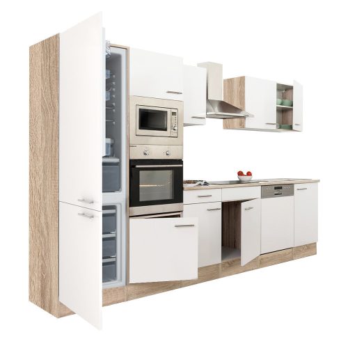 Yorki 340 konyhabútor sonoma tölgy korpusz,selyemfényű fehér fronttal alulfagyasztós hűtős szekrénnyel