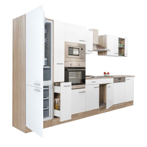 Yorki 370 konyhabútor sonoma tölgy korpusz,selyemfényű fehér fronttal alulfagyasztós hűtős szekrénnyel
