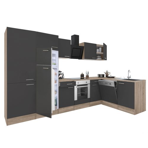Yorki 340 sarok konyhabútor sonoma tölgy korpusz,selyemfényű antracit front alsó sütős elemmel polcos szekrénnyel, felülfagyasztós hűtős szekrénnyel