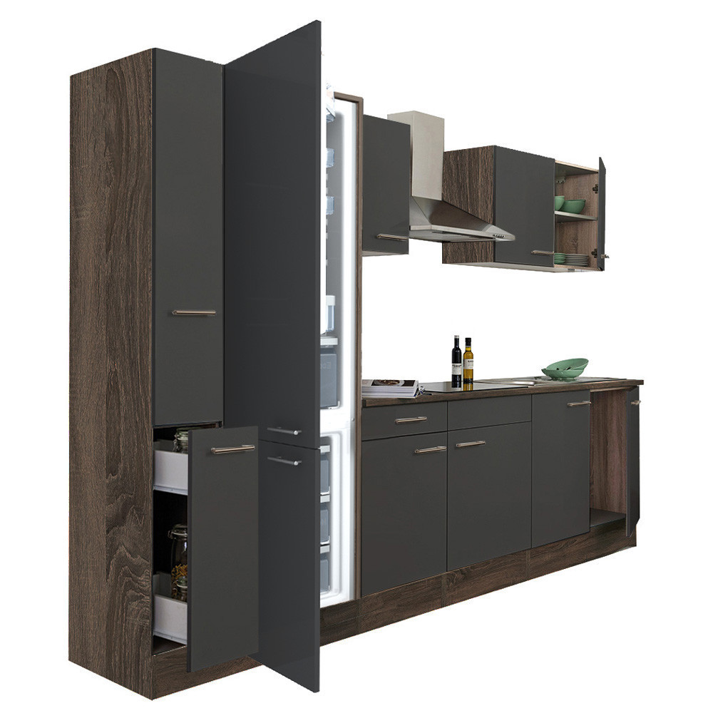 Yorki 300 konyhabútor yorki tölgy korpusz,selyemfényű antracit fronttal alulfagyasztós hűtős szekrénnyel
