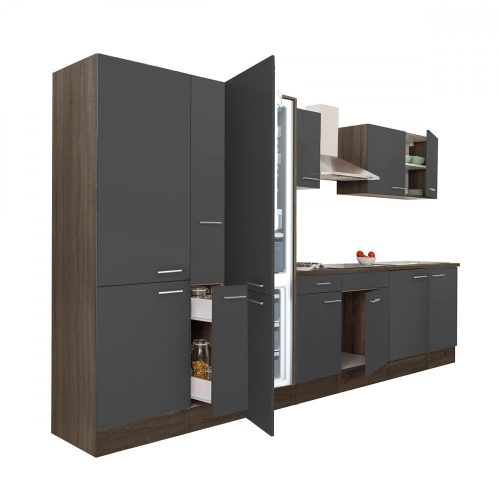 Yorki 360 konyhabútor yorki tölgy korpusz,selyemfényű antracit fronttal polcos szekrénnyel és alulfagyasztós hűtős szekrénnyel
