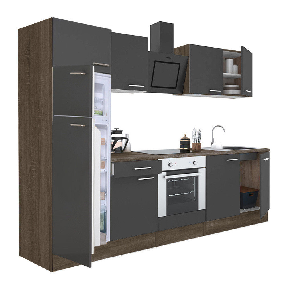 Yorki 270 konyhabútor yorki tölgy korpusz,selyemfényű antracit front alsó sütős elemmel felülfagyasztós hűtős szekrénnyel